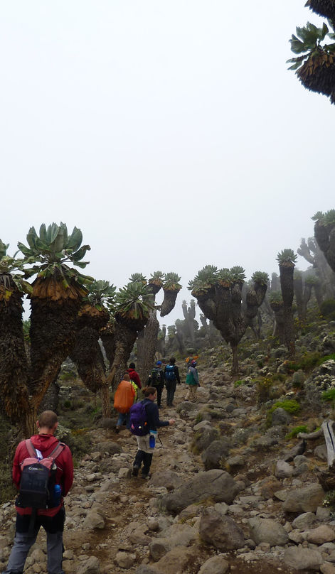 We get to the top of the forest after about an hour and then walk through moorland until we reach Shira Plateau, the views of Kilimanjaro are great from here. You will also be able to see Mt Meru rising above Arusha town in the distance.
